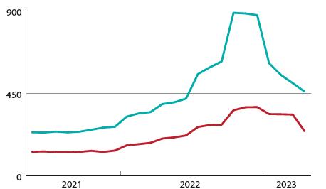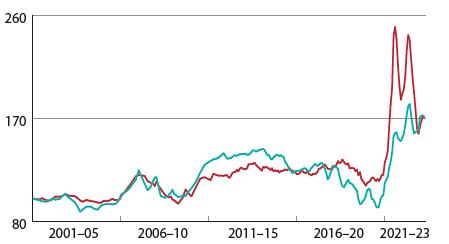 Index cien reziva (červená) a guľatiny (modrá) Rakúsko 4/2023Index cien reziva (červená) a guľatiny (modrá) Rakúsko 4/2023